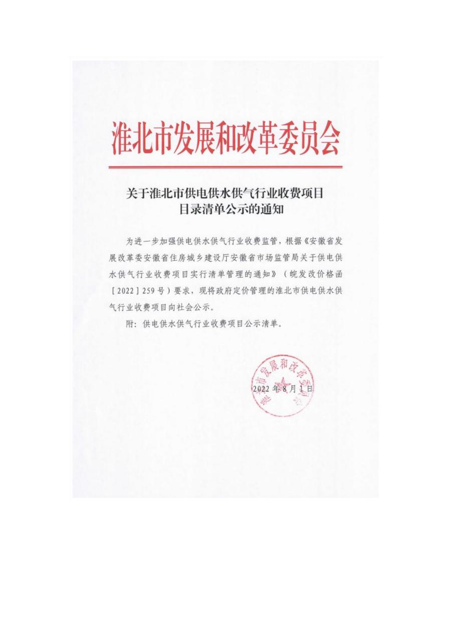 關(guān)于淮北市供電供水供氣行業(yè)收費項目目錄清單公示的通知