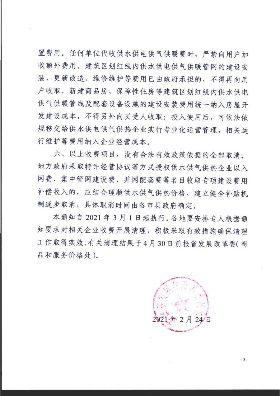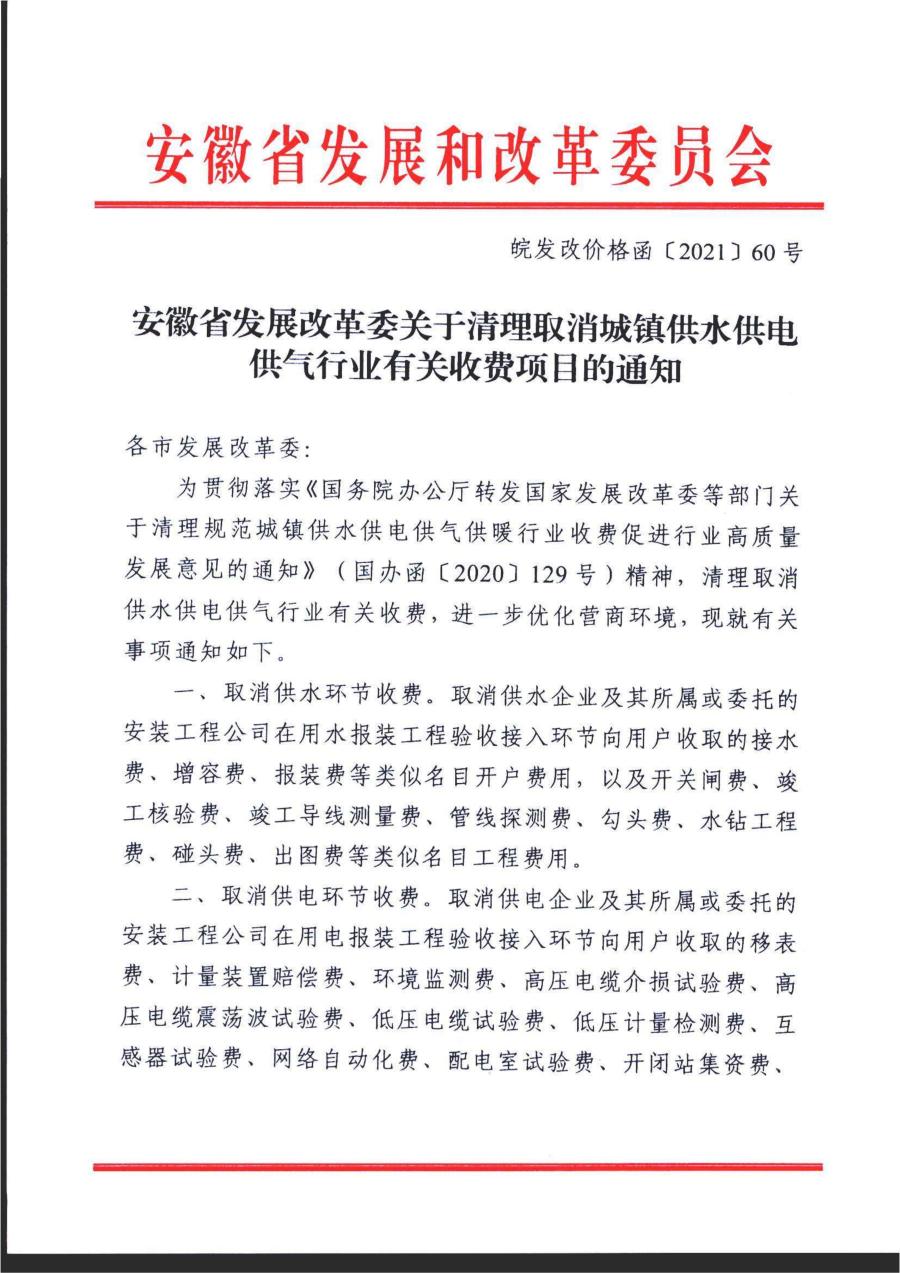 安徽省發(fā)展改革委發(fā)布關于清理取消城鎮(zhèn)供水供電供氣行業(yè)有關收費項目的通知》皖發(fā)改價格函【2021】60號